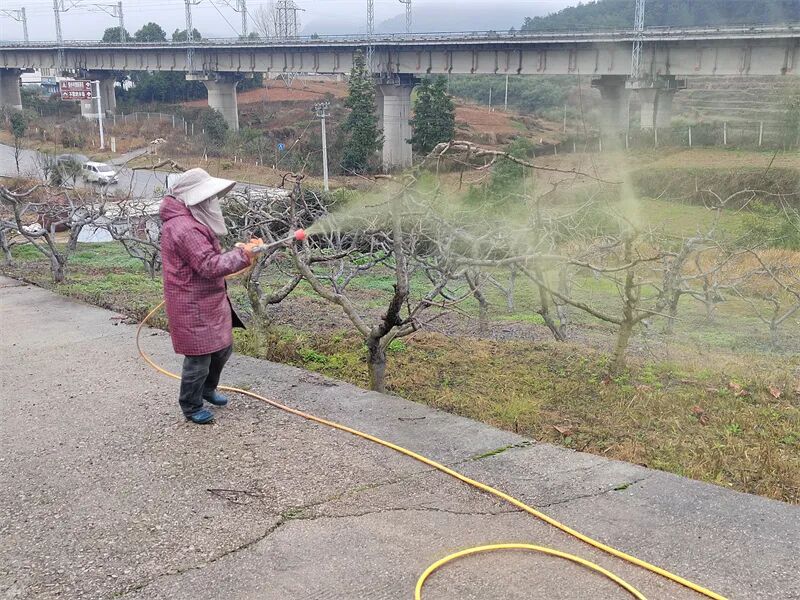桃林里,伴随着机器轰鸣,一条黄色的管子延伸至桃林深处,工人们两两一组,一个捋顺管子,一个手持喷头,对黄桃树树干、枝丫喷洒石硫合剂,为桃树穿上“防护服”。
